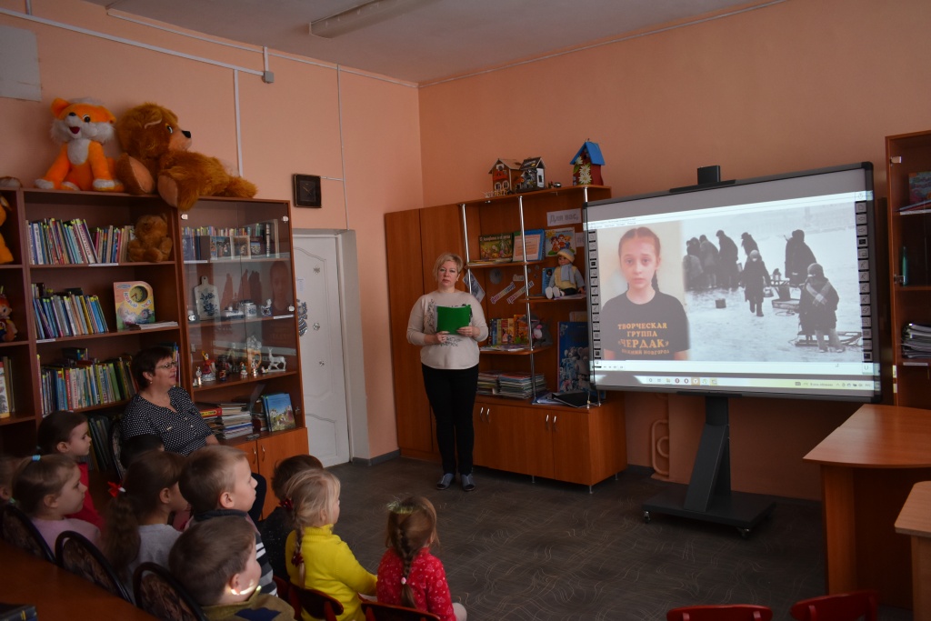 В методическом кабинете детского сада была организована выставка художественной литературы «Блокадный Ленинград». Дошкольники познакомились с творчеством отечественных поэтов и писателей, которые отразили в своих произведениях тяжелые воспоминания о блокадном детстве. С большим интересом ребята рассматривали картины и иллюстрации, просмотрели видеофильмы «Дети блокады», «Дорога жизни», «Блокадный хлеб».