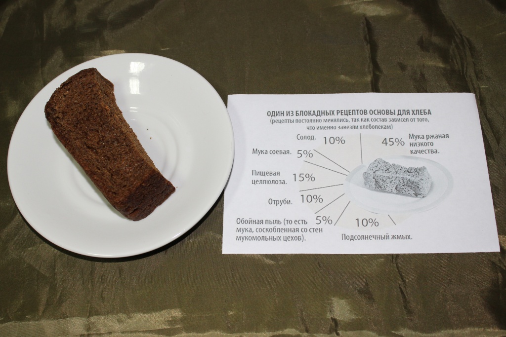 Особое место на выставке занимает кусочек хлеба… Те самые 125 грамм которые получали дети блокады… Рядом с блюдцем расположена информация из чего тот хлеб пекли.