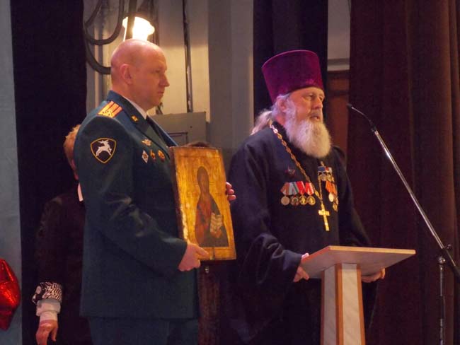 Группа гостей поздравила военнослужащих Внутренних войск и в заключении отец Георгий подарил командиру в/ч 3509 полковнику Александру Беляеву икону.